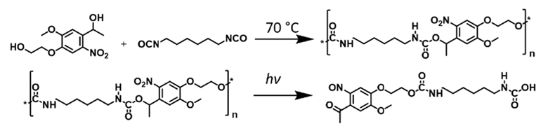 Barner-Kowollik和他的同事開發(fā)的策略是利用紫外光降解聚氨酯。聚氨酯通常是通過二異氰酸酯與多元醇反應(yīng)來制備的,該小組的目標(biāo)是使用多元醇引入聚合物的光降解性。在將光敏的o-硝基芐基基團加入到它們的起始二元醇中后,與二異氰酸酯進行階梯生長聚合,形成了在每一個其他單體單元處具有可光解點的聚合物。在紫外光照射下,鄰硝基芐基基團發(fā)生Norrish II型反應(yīng),最終導(dǎo)致C-O鍵異解裂變,形成酮-亞硝基化合物。